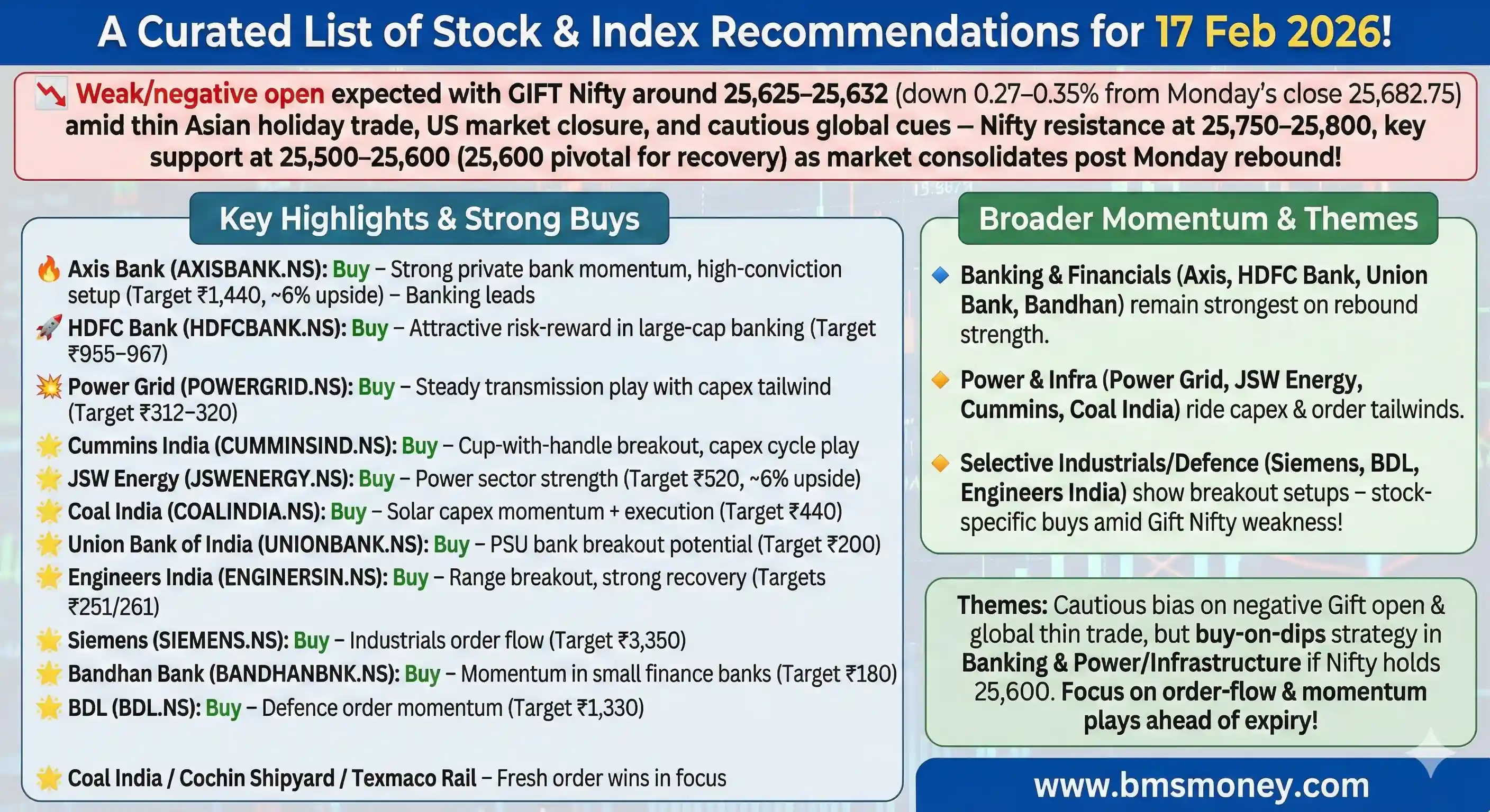 Indian markets are poised for a weak opening on February 17, 2026, as Gift Nifty signals a negative start amid mixed Asian cues and continued foreign outflows. Despite strong domestic buying and resilience in banking and infrastructure themes, global caution ahead of Lunar New Year holidays may cap early gains. Fresh analyst calls highlight selective opportunities in pharma, shipping, and rail stocks.