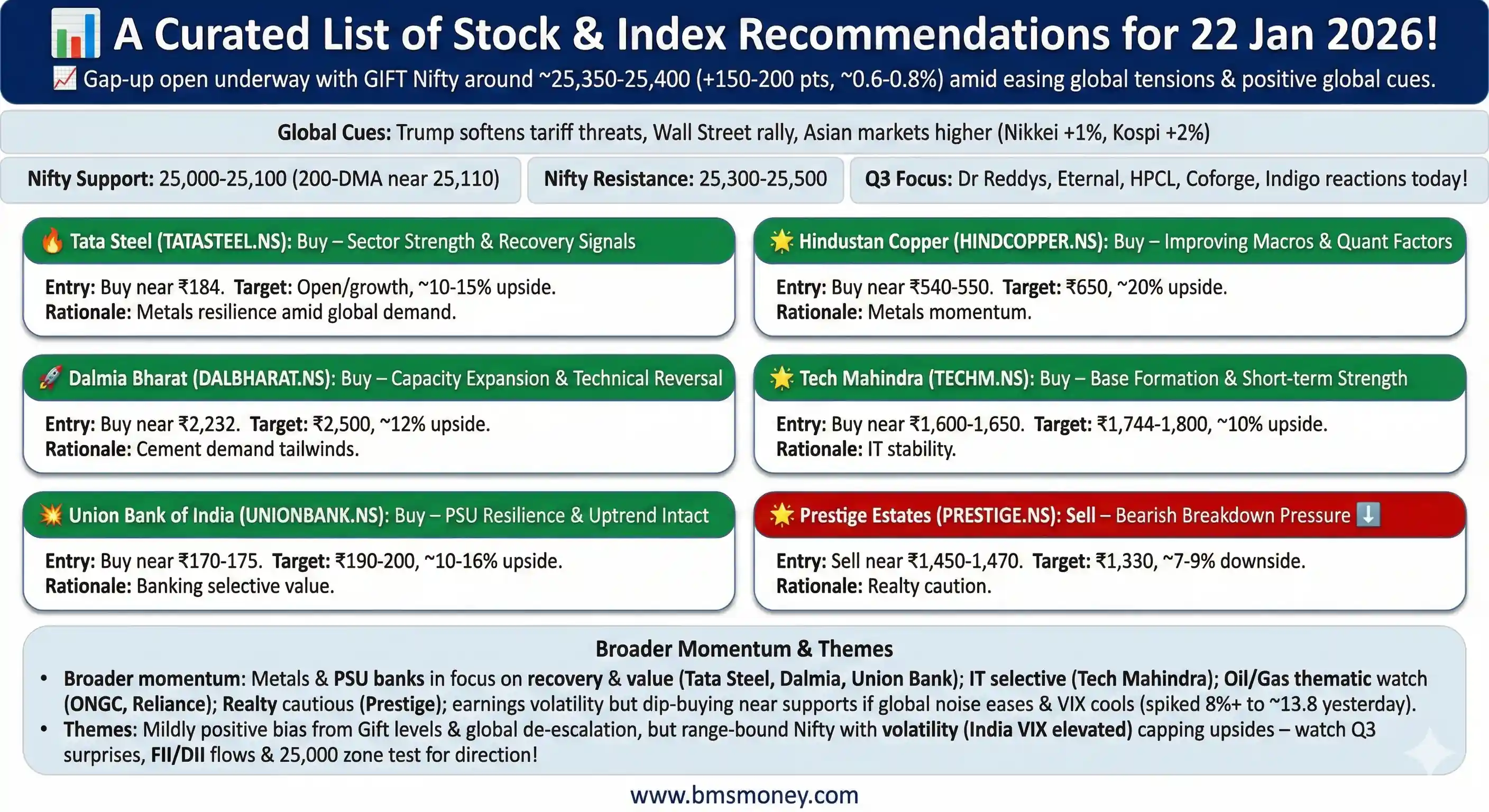 - Jindal Stainless (JSL.NS) – Watch/Buy, Rationale: In focus post-results; stainless demand. Source: Moneycontrol.