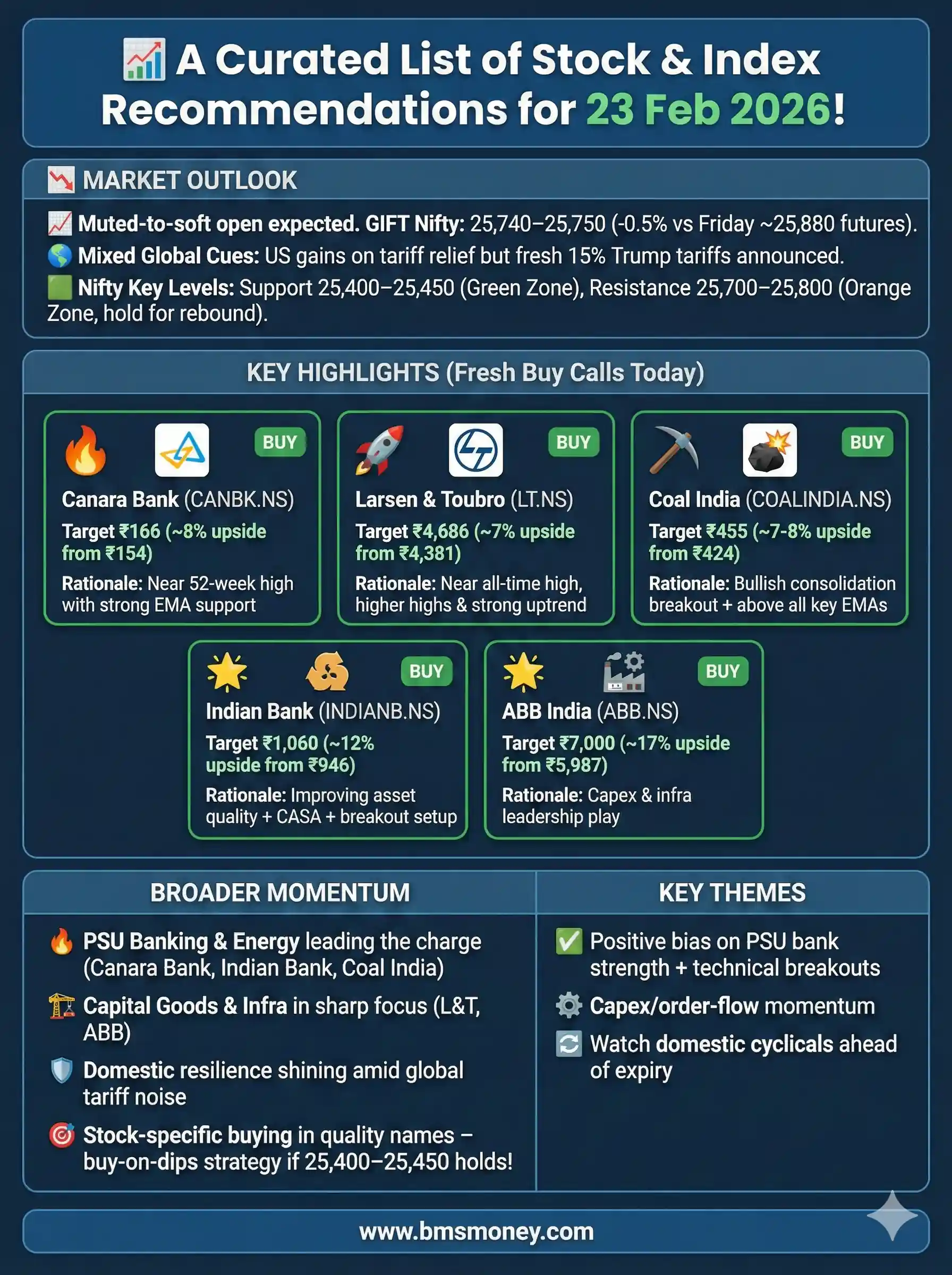 Conclusion & Disclaimer Overall market sentiment is neutral-to-cautiously positive for February 23, with domestic resilience likely to offset global tariff jitters. Investors should watch Nifty’s hold above 25,400–25,450 and strength in PSU banks/infra names. Actionable takeaway: Focus on quality domestic plays with strong technicals and order flows (Coal India, L&T, Indian Bank, ABB India) while monitoring tariff-related volatility in export sectors.