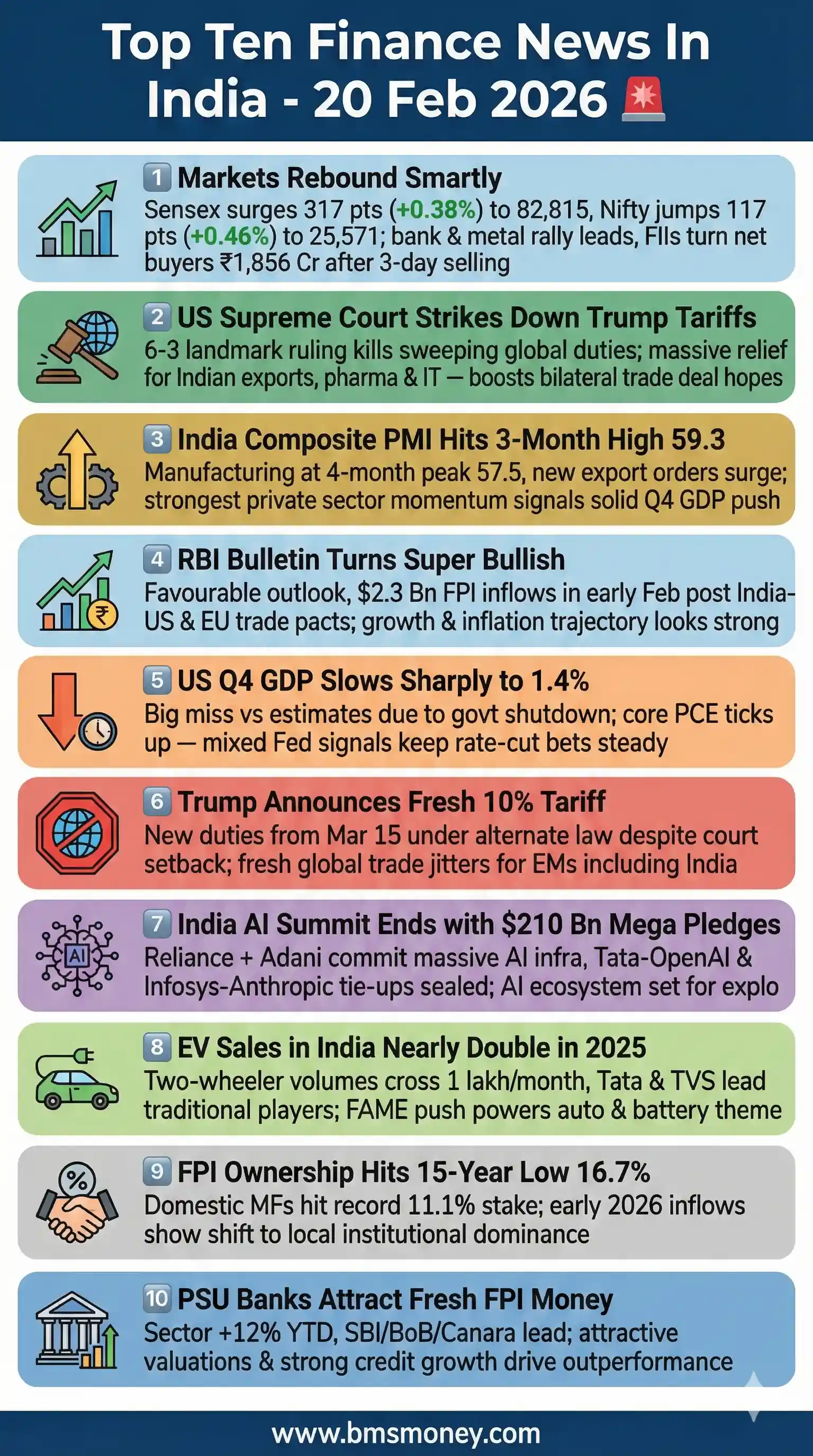 Indian markets rebounded modestly on February 20, 2026, closing the week with marginal gains as selective buying in banks and metals helped offset early pressures from geopolitical tensions and elevated oil prices. Strong domestic PMI data, renewed FPI inflows, and positive AI-sector developments underpinned cautious optimism, despite lingering IT weakness and global trade uncertainties.