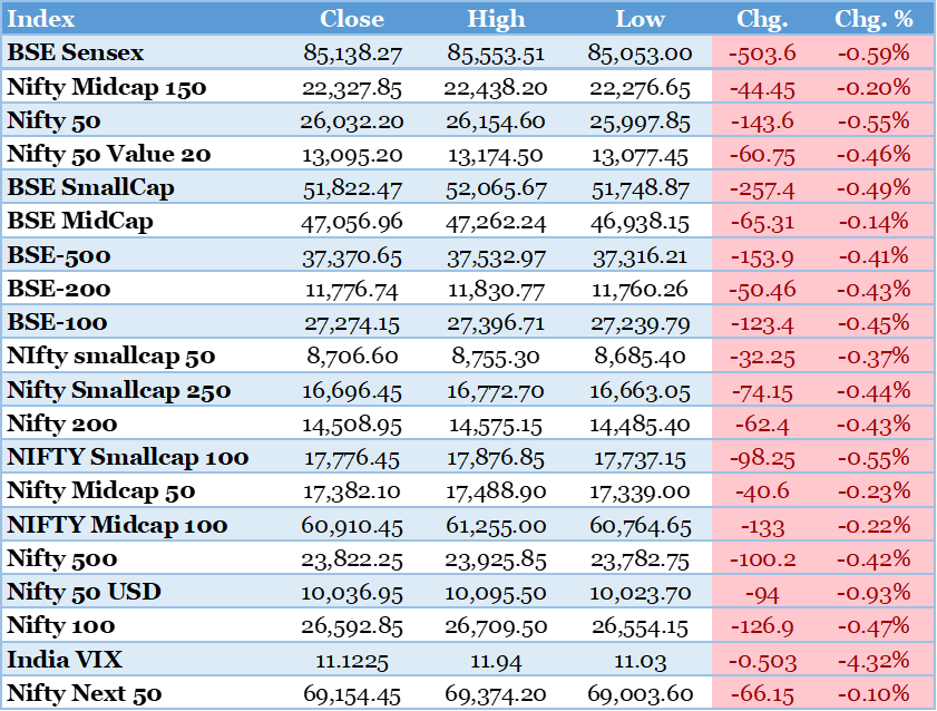 Indian stock markets extended losses for the second straight day on December 02, 2025, driven by profit booking at higher levels. The BSE Sensex closed down 504 points or 0.59% at 85,138, while the NSE Nifty settled 144 points or 0.55% lower at 26,032. Investors lost nearly ₹2 lakh crore as market capitalisation declined to ₹472.59 lakh crore. All major sectoral indices ended lower except Nifty Pharma, with Nifty Bank falling 0.68% and Nifty Financial Services dropping 0.90%. Broader markets outperformed benchmarks, with BSE Smallcap down 0.49% and BSE Midcap down 0.14%. The fall was attributed to a weakening rupee, persistent FII outflows, and NSE's sectoral index overhaul. Experts noted solid domestic macro fundamentals may provide support amid US-India trade uncertainties. Fading expectations for RBI rate cuts followed strong GDP data. This correction highlights short-term volatility but underscores underlying economic strength. Immediate implications include reduced investor confidence and potential pressure on rate-sensitive sectors.
