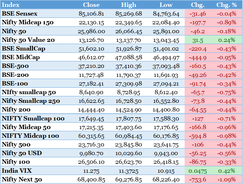 Indian equity benchmarks declined for the third straight session on December 03, 2025. The BSE Sensex closed down 31 points at 85106. The NSE Nifty fell 46 points to 25,986. The majority of Sensex stocks traded in the red, led by HUL and Titan. Broader markets saw the MidCap index drop 0.89 percent. The SmallCap index declined 0.44 percent. Nifty IT held gains due to rupee weakness, benefiting exporters. Nifty PSU Bank dropped nearly 3 per cent on profit booking. The decline reflects risk-off sentiment amid FII outflows. Immediate implications include reduced market capitalisation and investor caution.