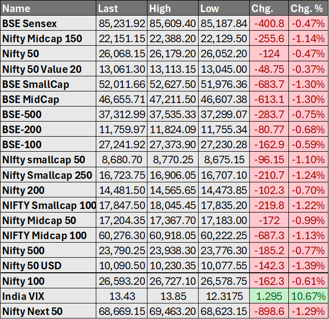 Indian benchmark indices closed lower due to widespread selling across sectors, with the Sensex dropping 400.76 points to 85,231.92 and Nifty declining 124 points to 26,068.15. The downturn snapped a two-day gaining streak, influenced by a global sell-off triggered by mixed U.S. jobs data that clouded interest rate outlooks. Metal and realty sectors led the losses, falling over 2%, while broader markets underperformed with midcap and smallcap indices down 1% each. Despite the daily decline, weekly gains remained positive at 0.8% for Sensex and 0.6% for Nifty. Market breadth favored bears, with advance-decline ratio at 1:2, signaling limited participation in recent rallies. Volatility rose 13% as India VIX hit 13.68, reflecting heightened uncertainty.