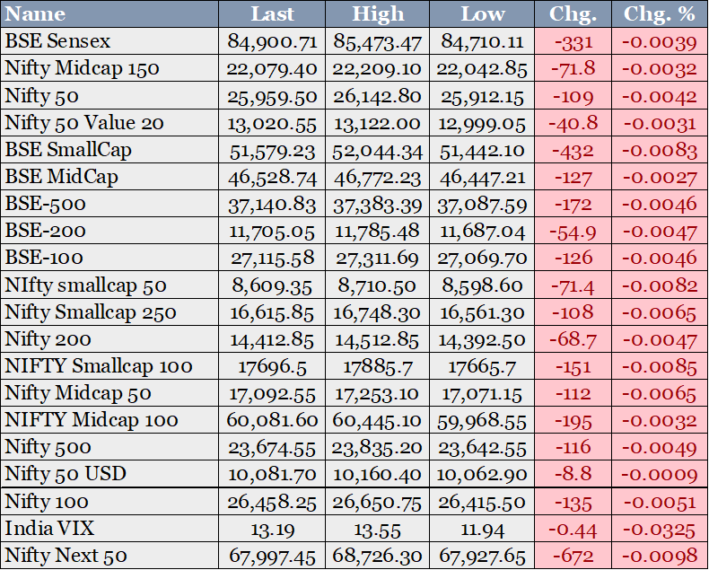 Indian markets closed lower on November 24, 2025, amid volatile trading and profit-taking, with the Sensex declining over 331 points and Nifty slipping below 26,000, reflecting cautious investor sentiment despite IT sector gains. The day was influenced by global cues, RBI's signals on potential rate cuts, and ongoing corporate earnings recovery. Key themes included currency interventions, macroeconomic stability, and regulatory enhancements in financial sectors.
