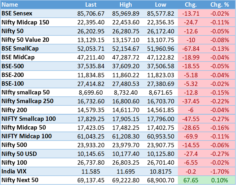 Indian benchmark indices experienced significant intraday swings but ended nearly unchanged, with the Sensex down 14 points at 85,847 and Nifty at 26,203. Trading was marked by caution as investors awaited Q2 GDP numbers and IIP data releases. Bank Nifty bucked the trend, hitting a fresh record high driven by gains in major lenders. Sectoral performance was mixed: pharma and auto advanced 0.5-1%, while oil & gas and telecom declined 0.5%. Top gainers included Adani Enterprises and Sun Pharma; losers featured Power Grid and HDFC Life. The flat close reflects balanced global cues and domestic data anticipation, potentially setting up for post-GDP rallies. Broader indices like midcap and smallcap also ended flat.