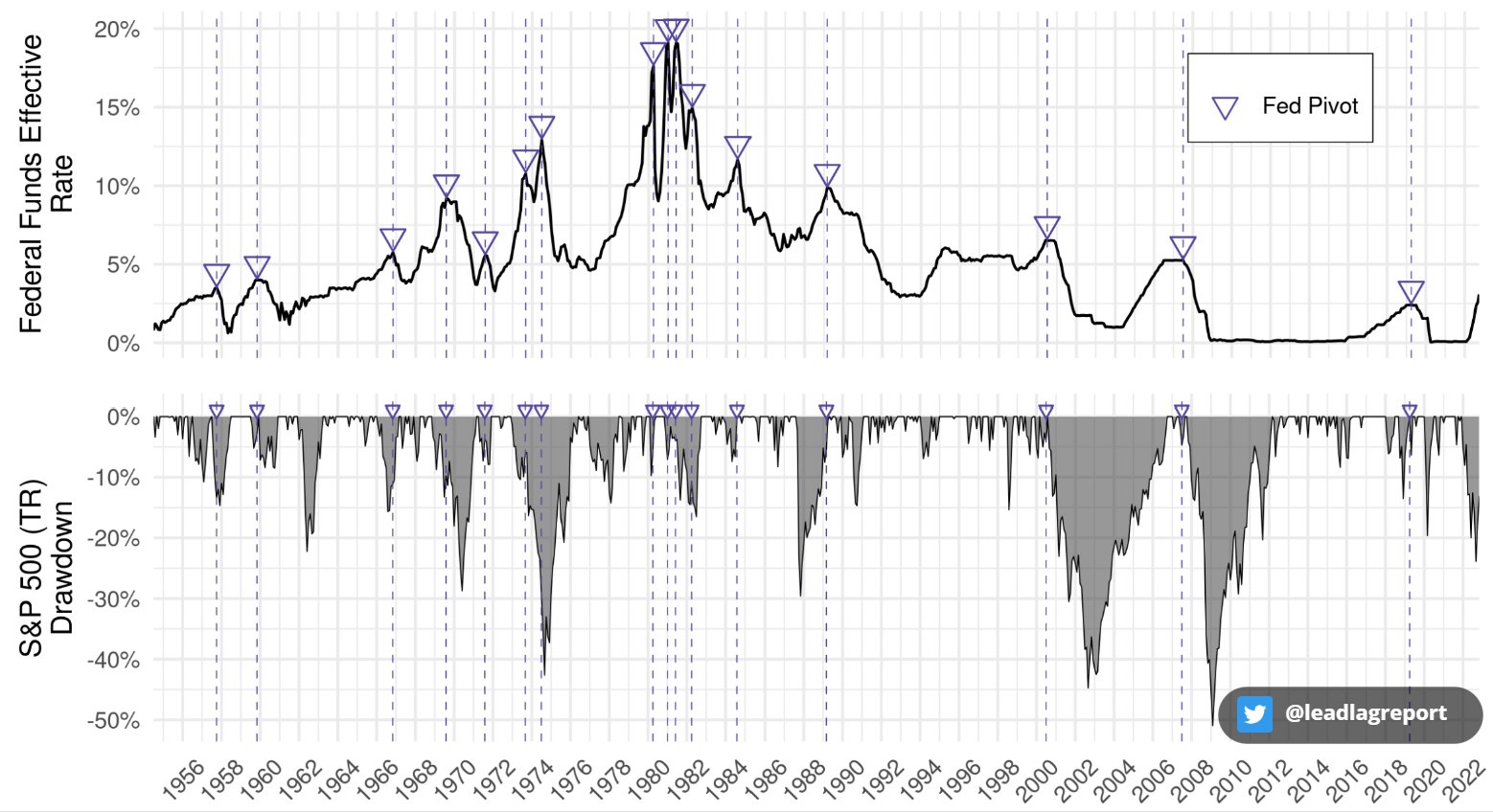 The Fed pivots mostly BEFORE major drawdowns in the S&P 500." Chart is sourced from his twitter feed please follow he is great.