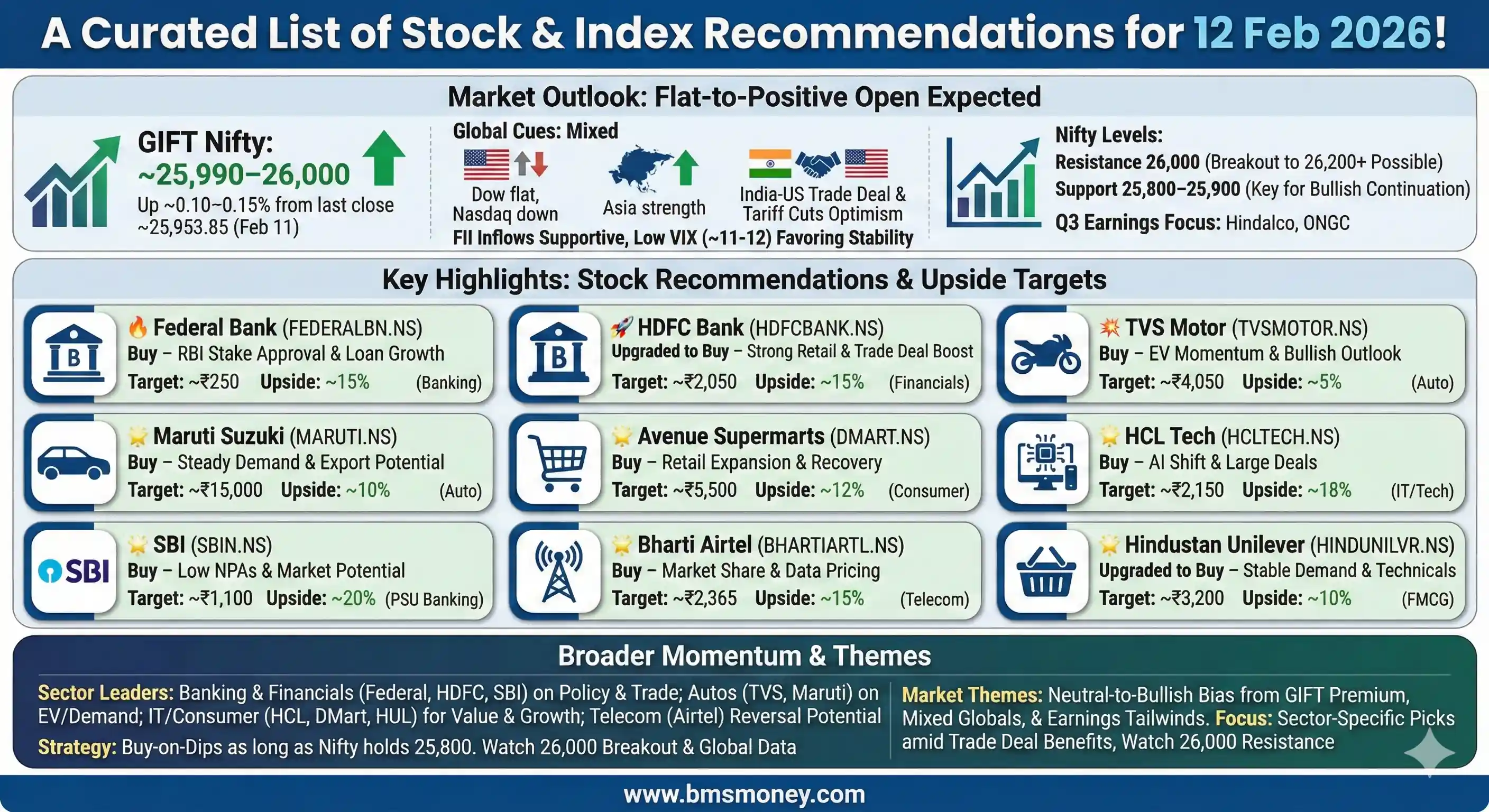 Key themes today include renewed focus on banking and autos amid India-US trade deal optimism, which reduces tariffs on Indian goods to 18% from 50%, potentially boosting exports. Total recommendations compiled: 25 unique calls from brokerages like Motilal Oswal, ICICI Direct, and NDTV Profit. Standout picks: TVS Motor upgraded to Buy by Business Line with a target of ₹4,050 (upside 5%); Federal Bank as a consensus Buy from multiple sources; and upgrades in large-caps like HDFC Bank. Investors should monitor Q3 earnings from companies like Hindalco, ONGC, and Hindustan Unilever for sector-specific triggers.