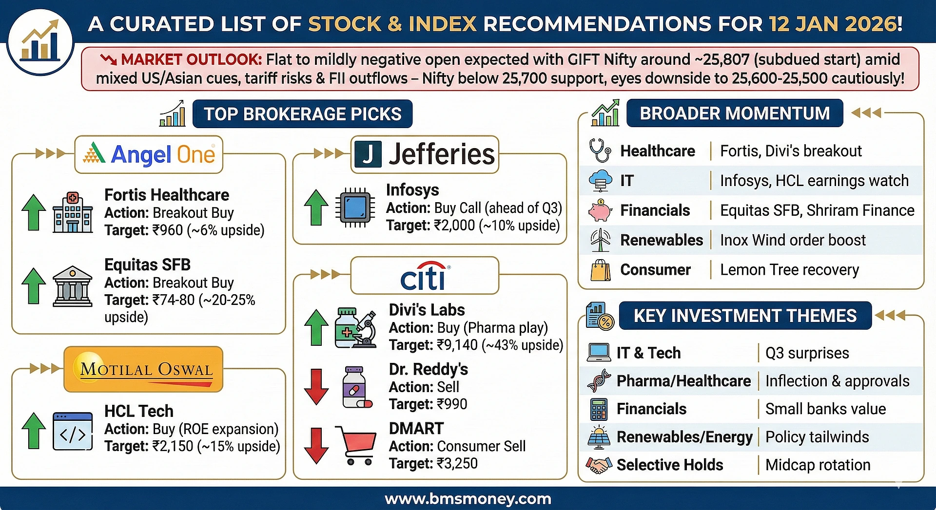 Key themes today include cautious sentiment in IT and banking sectors ahead of Q3 earnings from majors like TCS and HCLTech, alongside renewed focus on healthcare and financials amid regulatory updates. A total of around 15-20 recent recommendations were aggregated from credible sources, though fresh calls specifically dated January 12 were sparse due to the early timing of the report (pre-market snapshot). Standout calls include Angel One's buy on Fortis Healthcare (target ₹960) and Equitas Small Finance Bank (target ₹74-80), alongside broader upgrades in renewables and pharma from global firms like Citi and Jefferies. Investors should monitor US-India trade developments and potential tariff rulings for volatility.