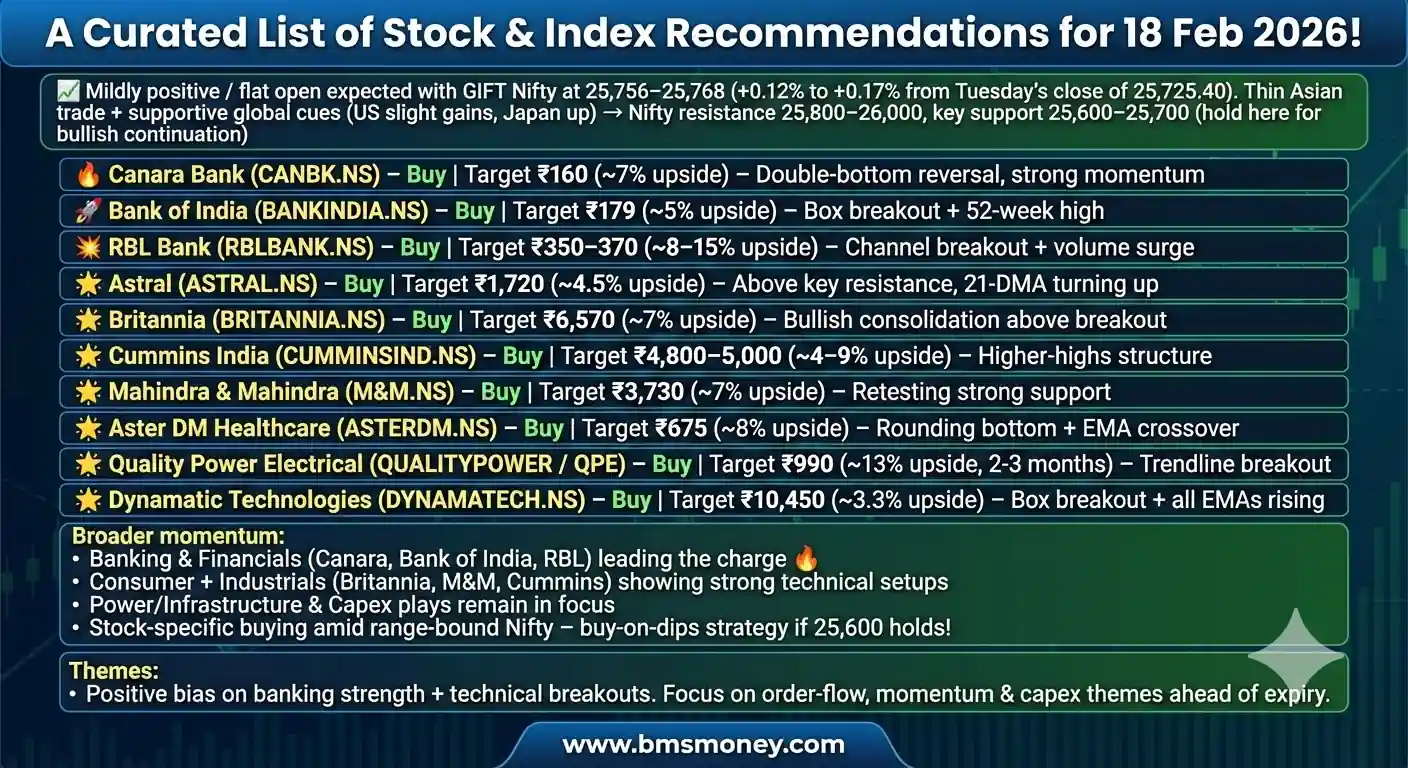 Indian markets are set for a flat-to-mildly positive opening on February 18, 2026, tracking supportive global cues and continued momentum in banking and financials. With volatility easing and select mid-cap breakouts in focus, early trade may see range-bound moves amid thin holiday volumes in parts of Asia. Fresh technical calls highlight opportunities in consumer, industrial, and banking stocks.