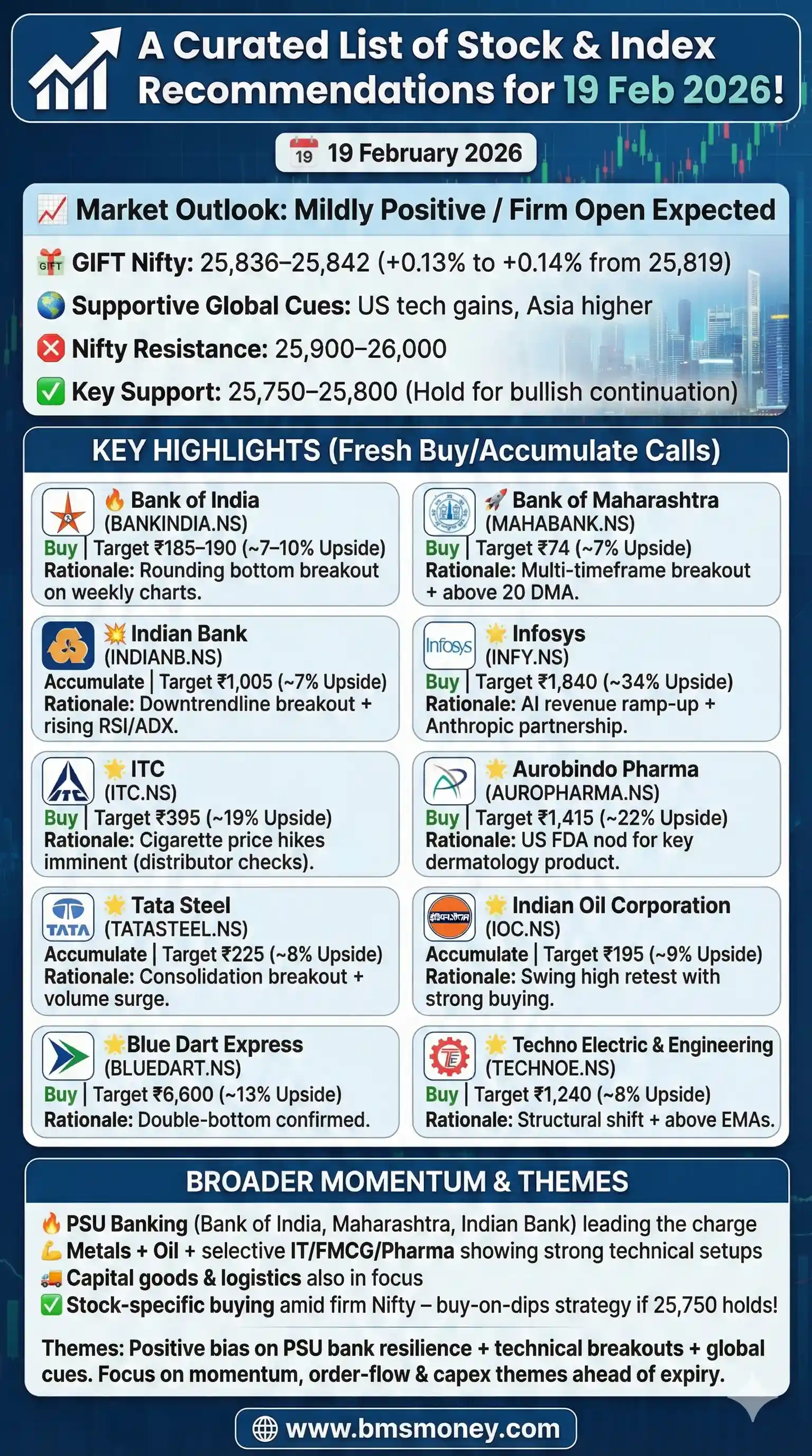 Note: February 19 is a settlement holiday (Chhatrapati Shivaji Maharaj Jayanti), meaning equity and derivatives trading on NSE/BSE proceeds normally, but clearing/settlement and fund payouts are paused. This pre-market snapshot (as of ~7:30 AM IST) aggregates fresh analyst calls and technical ideas published or updated today from credible sources. Around a dozen unique recommendations emerged this morning, centered on IT/AI tailwinds, FMCG pricing power, PSU bank strength, and technical breakouts. Broader themes include continued outperformance in PSU banks/metals and selective global brokerage updates on AI execution and regulatory approvals. Standout calls include BofA maintaining Buy on Infosys, Axis Securities accumulating Bank of India, and technical Buy on Blue Dart Express. Volatility may persist near key levels, with investors watching FII flows and global risk sentiment.