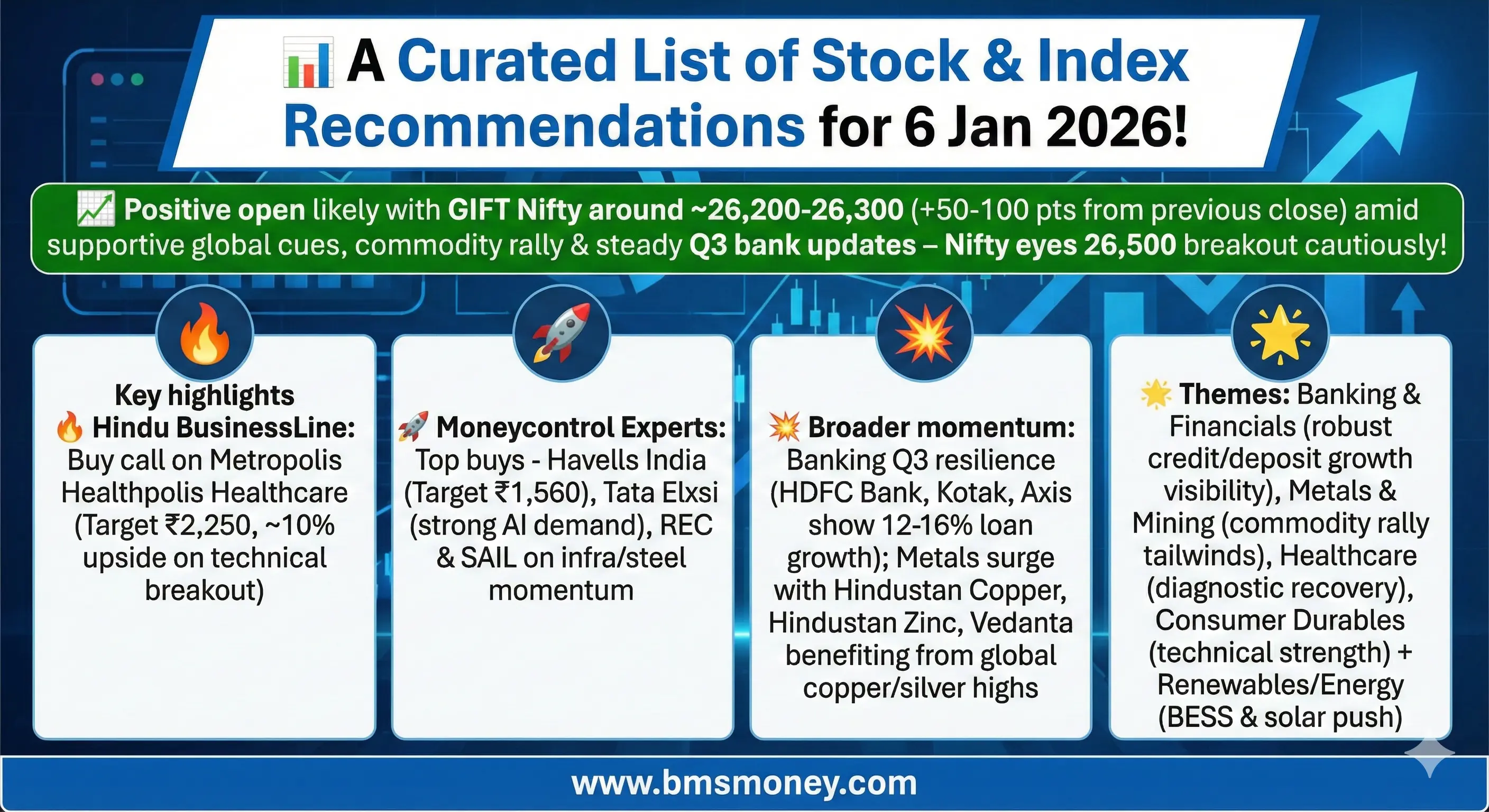 Key themes today include robust Q3 business updates from banks, a rally in metals like copper, silver, and gold (with prices hitting near-record highs), and focus on battery energy storage systems (BESS) amid renewable energy push. A total of around 30-40 unique recommendations and watchlist items emerged from credible sources, emphasizing sectors like banking, metals, and healthcare. Standout calls include Metropolis Healthcare upgraded to Buy with a ₹2,250 target by Hindu BusinessLine, Havells India as a top buy idea from Moneycontrol experts, and bullish outlooks on Nifty from multiple analysts targeting 26,500–26,800. Investors should monitor early volatility as markets digest Q3 previews and global commodity trends.