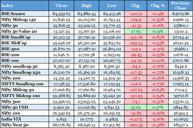 बाजार में लगातार तीसरे दिन गिरावट का माहौल रहा, जहां विदेशी निवेशकों की बिकवाली ने दबाव बनाया और सेंसेक्स-निफ्टी नीचे बंद हुए। कुल मिलाकर बाजार अस्थिर रहा, वैश्विक संकेतों और मुद्रा दबाव से प्रभावित, लेकिन कुछ सकारात्मक विकास जैसे विदेशी निवेश और कम ब्याज दरों की उम्मीद ने थोड़ी राहत दी। मुख्य थीम रहीं सरकारी नीतियां, कॉर्पोरेट डील और कमोडिटी मूल्यों में उतार-चढ़ाव।