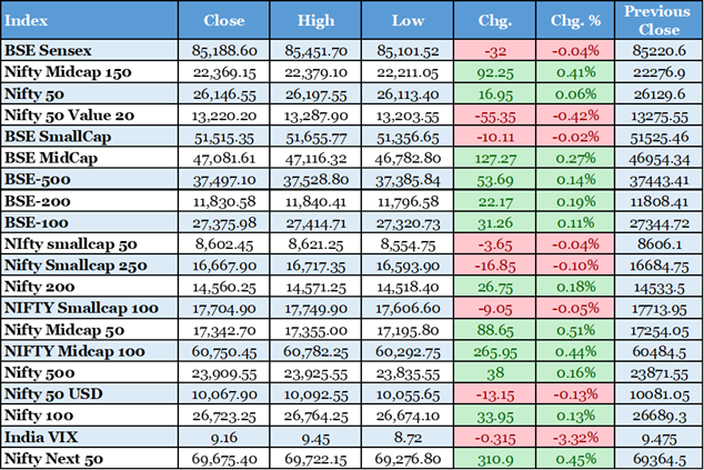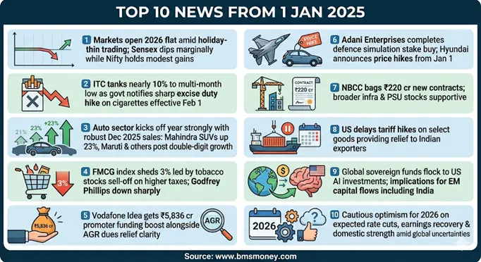 The BSE Sensex settled marginally lower by 32 points at 85,188.60, while the NSE Nifty edged up 17 points to 26,146.55 in the opening trading session of 2026. Trading volumes remained thin due to the New Year holiday, with global markets largely closed. Gains in IT, auto, and metal stocks cushioned the indices, but a sharp 9.7% drop in ITC shares dragged the FMCG sector down 3.2%. The government announced an additional excise duty on tobacco products effective February 1, reigniting concerns over volume growth and illicit trade for market leader ITC. Broader markets showed resilience, with midcap and smallcap indices posting modest gains. Analysts noted that the flat close reflects cautious positioning ahead of key data like industrial production and potential FII flows. Domestic institutional investors supported the market, offsetting minor foreign outflows. Sectorally, auto stocks rallied on strong December sales figures, while banking and PSU stocks contributed positively. The rupee held steady against the dollar in limited forex trading. For the Indian economy, this muted start underscores ongoing recovery in consumption-driven sectors like autos. However, higher duties on tobacco could moderate discretionary spending in FMCG. Overall, the session signals stability with selective opportunities in growth sectors. Expectations for 2026 remain positive, driven by anticipated earnings recovery and policy support. Investors are advised to focus on quality large-caps amid valuation normalization. The day's volatility highlights risks from regulatory changes in key consumer segments. Looking ahead, progress on trade deals and monsoon outcomes could drive momentum.