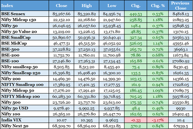 Indian benchmark indices extended gains on December 12, 2025, with the BSE Sensex closing up approximately 450 points or 0.53% at around 85,268. The NSE Nifty settled higher by about 0.44%, reclaiming the 26,000 mark. This rebound came after a positive opening, supported by strong performances in metal stocks like Hindalco and Tata Steel, which benefited from global commodity trends. Auto shares also contributed significantly following the release of record November wholesale data. Broader markets participated in the upmove, with midcap and smallcap indices outperforming. Sectoral rotation was evident, with realty and metals leading while some FMCG names lagged. The rally reflected improved global liquidity sentiment post recent policy actions abroad. Domestic institutional buying offset moderate foreign outflows. Volatility remained contained as investors awaited further data points. This performance marked a continuation of resilience despite currency pressures. Overall trading volumes were healthy across cash and derivatives segments. Analysts noted support from festive spillover demand in consumer-linked sectors. The advance-decline ratio favored buyers on both exchanges. Banking stocks showed mixed trends amid steady bond yields. IT shares traded steady ahead of global cues. Energy names gained on crude stability. Pharma held firm on defensive appeal. Infrastructure plays rose on policy expectations. Realty benefited from rate-sensitive optimism. The market breadth indicated sustained participation beyond large-caps. This close positioned indices for potential further upside if global risks ease. Investors monitored upcoming economic indicators closely. The day's gains reinforced the year's positive trajectory for Indian equities.
