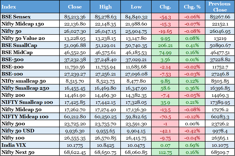 Indian benchmark indices ended slightly in the red on December 15, 2025, with the BSE Sensex declining 54.30 points or 0.06% to 85,213.36 and the Nifty 50 slipping 19.65 points or 0.08% to 26,027.30 after recovering from intraday lows. Volatility stemmed from rupee weakness, continued FPI selling, and caution ahead of key US data releases, offset partially by gains in consumption and IT stocks like HUL, Trent, and Infosys. Auto and financial shares dragged, reflecting tariff concerns. Broader markets showed resilience with midcaps and smallcaps edging higher. This flat-to-negative close signals short-term consolidation, with domestic inflows cushioning foreign exits totalling over ₹1.6 lakh crore in 2025. Investors remain watchful of trade deal developments and global cues, which could influence near-term direction and sector rotations.