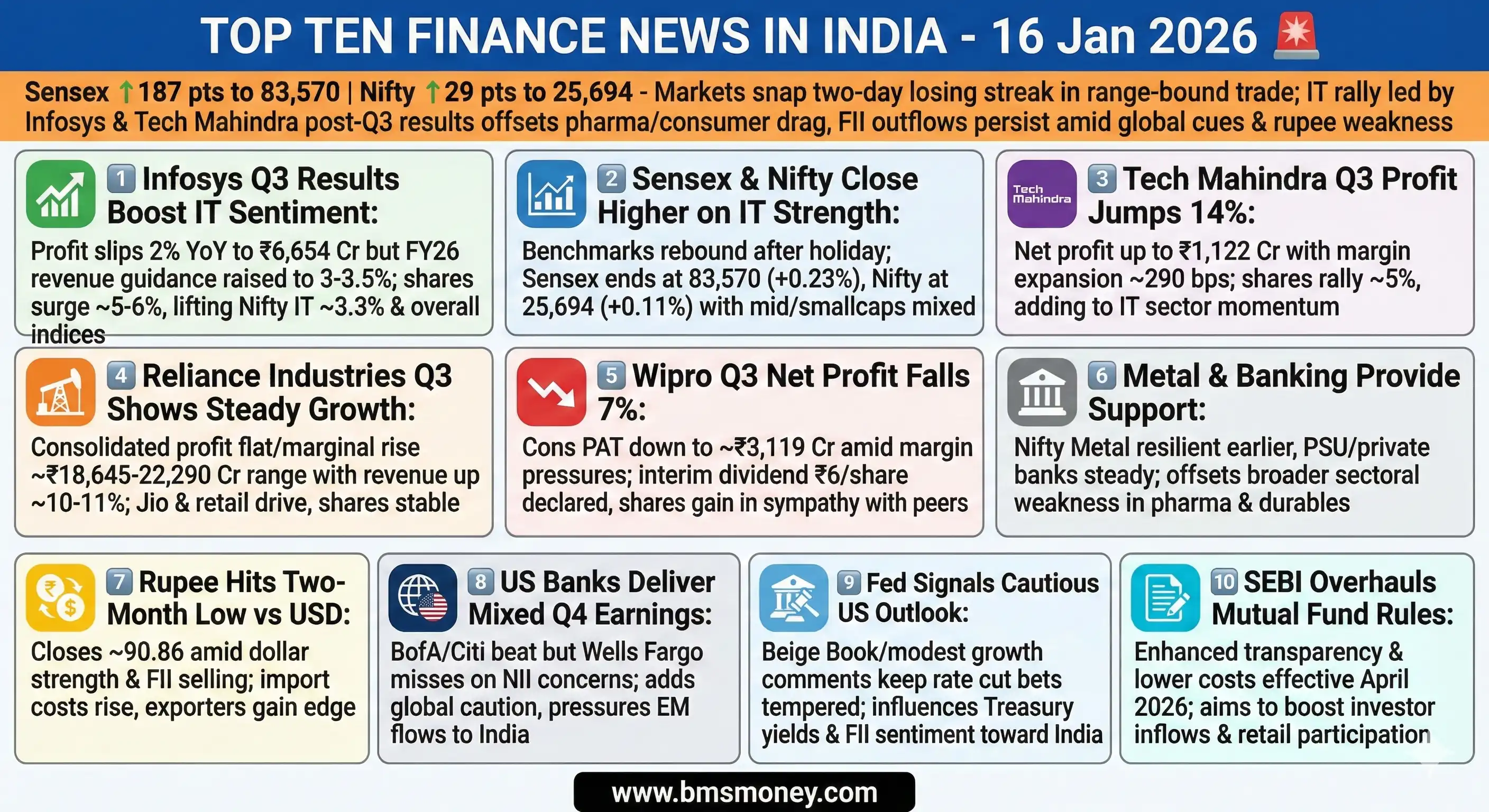 The Indian equity markets displayed a cautiously optimistic tone on January 16, 2026, with benchmark indices closing modestly higher amid a strong rally in IT stocks offsetting pressures from pharma and consumer sectors. Key drivers included positive surprises from Infosys' earnings and guidance upgrade, mixed performances from other major corporates like Reliance Industries, and ongoing global influences from US banking results and Fed commentary. Overall sentiment remained supported by domestic earnings momentum despite rupee weakness and FII outflows.