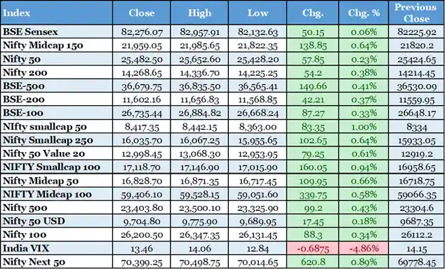 Indian equity markets opened with renewed vigour on the back of positive overnight cues from Wall Street and a relatively stable rupee, pushing the Sensex up nearly 300 points in early trade and the Nifty briefly crossing the 25,600 mark. However, sustained selling in heavyweight stocks such as Reliance Industries, HDFC Bank, and ITC triggered a gradual erosion of gains from midday onwards. By the close, the Sensex settled just 50 points higher at 82,276 while the Nifty added 58 points to end at 25,482.50, registering a modest 0.23% gain.