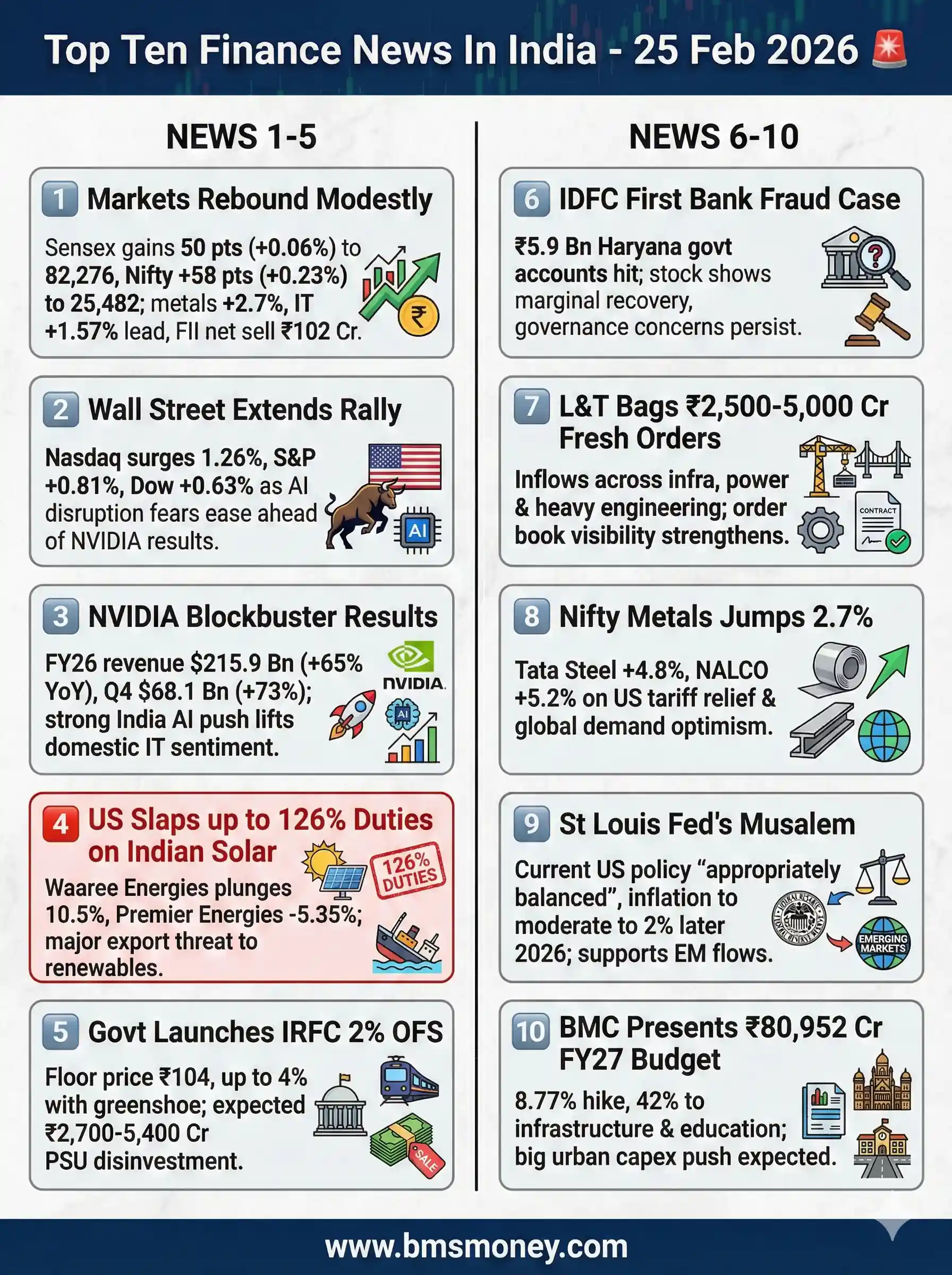 This briefing captures the dominant themes of February 25: selective domestic recovery supported by global tech optimism, tempered by trade frictions in renewables, and steady progress on policy and corporate fronts. Markets are expected to remain data-dependent with focus shifting to upcoming corporate earnings and global central-bank commentary.