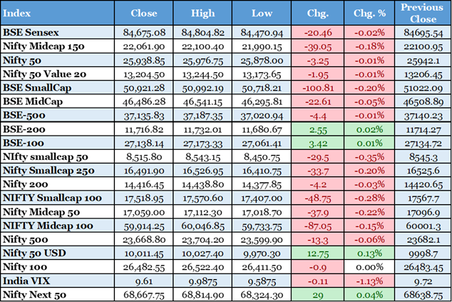 Indian benchmark indices ended slightly lower on December 30, 2025, with the Sensex down around 20-346 points variations reported, settling near 84,675, and Nifty flat to marginally down at approximately 25,938. Trading volumes remained low due to year-end holidays and caution ahead of derivatives expiry. Foreign institutional investors continued outflows, pressuring sentiment amid global uncertainties. Gains in metals, auto, and PSU banks offset losses in IT, FMCG, and pharma sectors. Broader markets also dipped modestly. Volatility was subdued as investors adopted a wait-and-watch approach. Despite the flat close, markets added significant investor wealth over 2025, up over 8%. This session reflected consolidation after recent gains. Immediate implications include limited directional moves until fresh triggers emerge in the new year. Overall, resilience persists supported by domestic inflows.