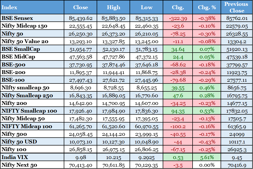 The Indian stock markets experienced a volatile trading session on January 05, 2026. The Nifty 50 index briefly touched a new all-time high of 26,373 during the day. However, profit booking emerged in the afternoon. This led to a reversal of early gains. The index closed 78 points lower at 26,250. Similarly, the BSE Sensex ended 322 points down at 85,439. IT stocks were the major drag. Concerns over potential US tariffs affected export-oriented sectors. Oil and gas shares also declined despite global crude surges. Banking stocks provided some support with positive quarterly updates. Broader market indices like midcaps and smallcaps ended flat. Sectorally, realty and consumer durables gained. Metal and FMCG added modestly. The volatility reflected mixed global cues. Asian markets rose on energy boosts. US markets awaited further developments. This session highlighted fragile underlying sentiment. High valuations persisted as a concern. Foreign outflows continued to pressure liquidity. Domestic institutional buying cushioned falls. Q3 earnings season approaches soon. Investors eye corporate results for direction. Geopolitical risks remain elevated. Venezuela events could sustain oil volatility. This may increase India's import bill. Overall market breadth weakened. Advance-decline ratio favored declines. Trading volume remained healthy. Options data showed cautious positioning. Implied volatility rose slightly. Near-term support for Nifty seen at 26,000 levels. Resistance placed around 26,400. Analysts recommend selective stock picking. Focus on fundamentally strong names. This closure sets a cautious tone for the week ahead.