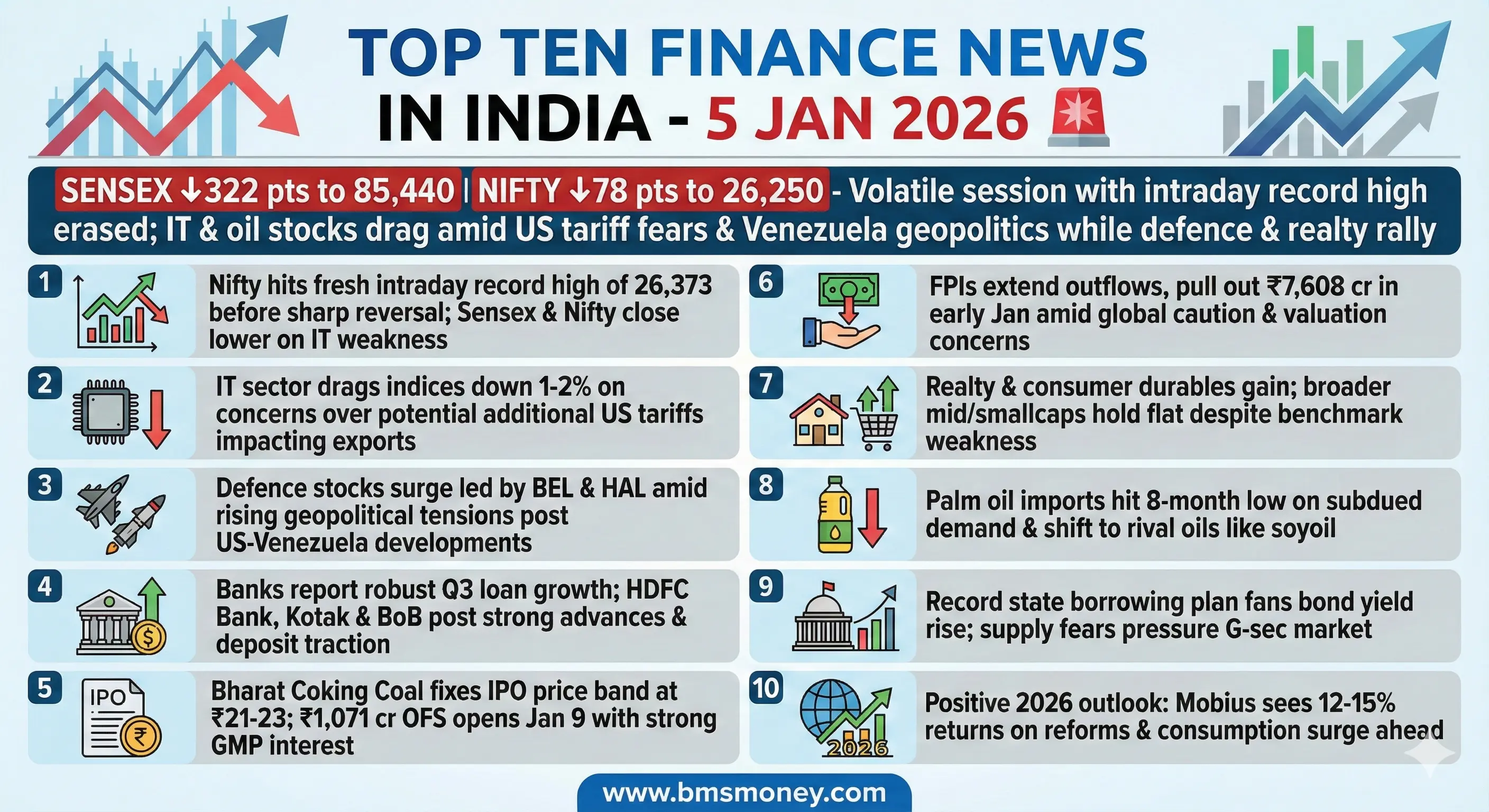 Indian equity markets displayed volatility on January 05, 2026, with the Nifty 50 hitting a record high intraday before closing lower amid IT sector weakness and geopolitical concerns from US-Venezuela tensions. Key themes included cautious foreign investor sentiment, robust banking updates offsetting drags, and global energy surges impacting commodity costs.