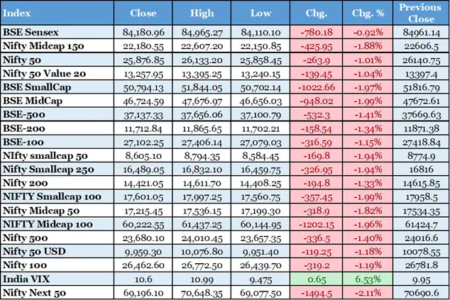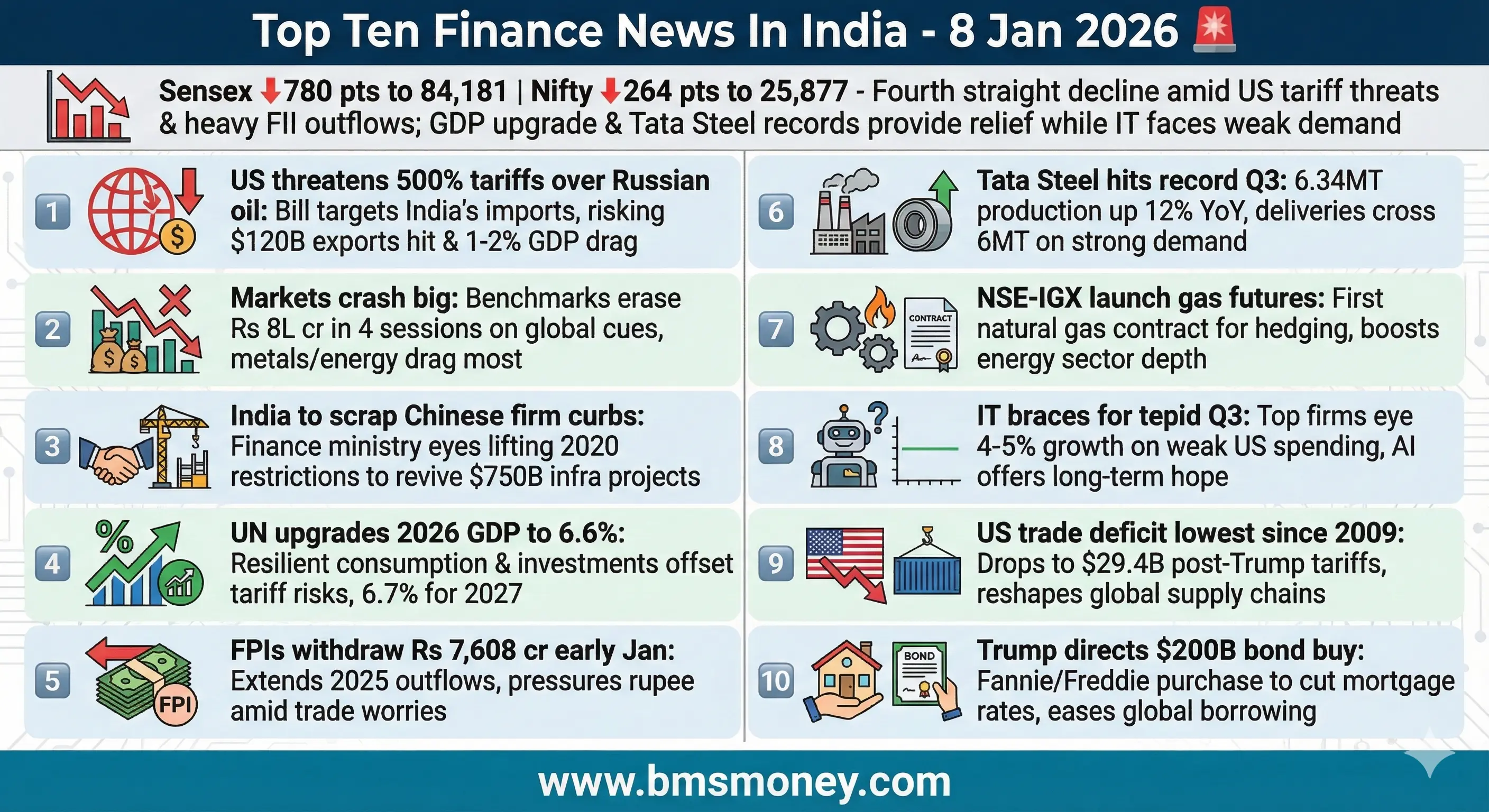 Indian benchmark indices traded lower for the fourth straight session. The BSE Sensex tumbled over 600 points to 84,367.47. The Nifty 50 dropped below 25,950 at 25,905.20. This marked a 235.55-point decline. All sectors were in the red. This reflected widespread weakness and selling pressure. Metals, information technology, and banking faced particular pressure. Defensives offered limited relief. The market slump was driven by geopolitical tensions. Looming U.S. tariffs under Trump contributed to the decline. Uneven corporate earnings added to the pressure. Trump's Russia tariff bill impacted India. Heavyweights dragged benchmarks down. Venezuela's political upheaval influenced sentiment. Subdued global markets played a role. A looming growth slowdown in H2 FY26 was a factor. Technicals signaled non-directional trading. Broader weakness was evident with cautious sentiment. Profit-taking and risk aversion suggested subdued markets. Stronger triggers are needed for recovery.