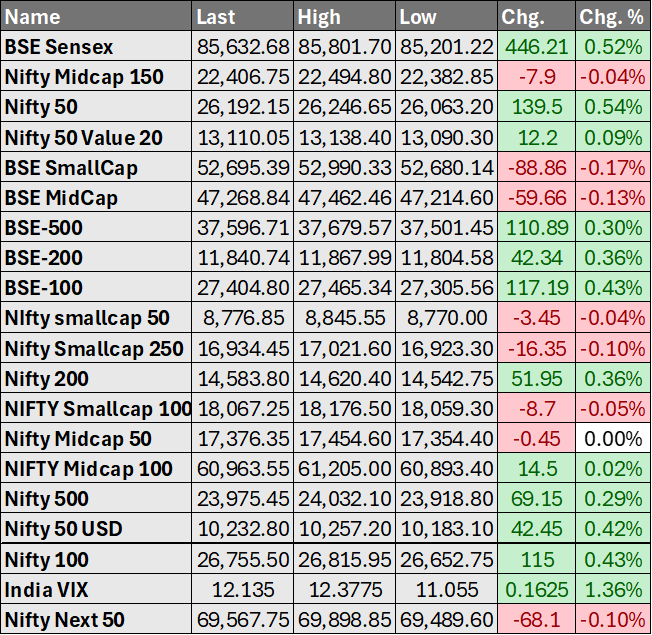 The benchmark indices closed on a positive note, with the Nifty settling near 26,200 and the Sensex gaining over 446 points. This uptick was fueled by strong buying in heavyweight stocks like Reliance Industries and Bajaj Finance, amid improved investor sentiment. The rally reflects recovery from recent volatility, supported by foreign inflows and solid quarterly results from key sectors. Broader markets showed mixed performance, but major indices outperformed, signaling sustained bullish momentum. Immediate implications include boosted investor confidence and potential for further gains if global cues remain favorable. Banking and IT sectors led the advance, contributing to the overall market capitalization increase. Money Control, https://www.moneycontrol.com/news/business/markets/stock-market-live-sensex-nifty-50-share-price-gift-nifty-latest-updates-20-11-2025-liveblog-13687099.html